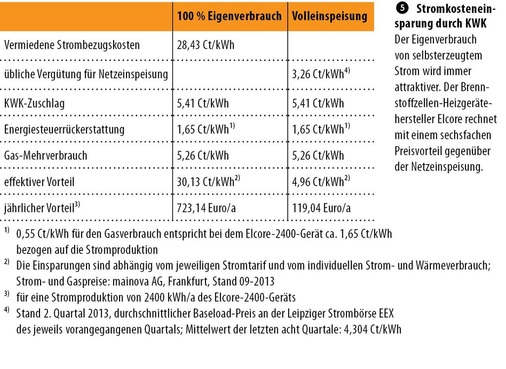 Durch den Eigenverbrauch des selbsterzeugten Stroms könne gegenüber der Stromeinspeisung ins Netz ein sechsfacher Kostenvorteil erwirtschaftet werden Abb. 5 , so Eichelbrönner. Da es sich beim Elcore-Gerät um eine autonom arbeitende Beistelllösung handele, könne das Brennstoffzellen-Heizgerät beliebig mit anderen Heizgeräten kombiniert werden. Der Zielpreis des Aggregats liegt derzeit bei 9000 bis 10000 Euro, die aktuelle Standzeit der Stacks bei rund fünf Jahren. Ziel der weiteren Entwicklung sei eine Standzeit von 80000 h, also von rund zehn Jahren.