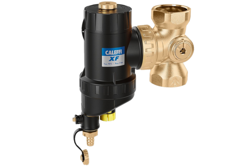 Caleffi, 9.1-A42: Der Schmutzfänger Caleffi XF ist speziell für die hohen Volumenströme in Wärmepumpenanlagen ausgelegt und schützt ihre Komponenten und Bauteile vor der verschleißenden Wirkung im Wärmeträger enthaltener Verunreinigungen. Über einen internen Mechanismus reinigen Bürsten das Filtergewebe ohne Demontage.