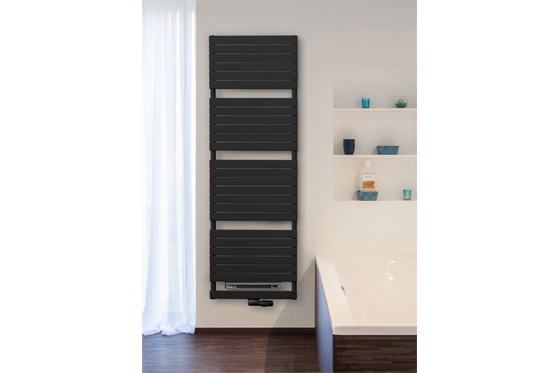 Vasco, 12-C19: bringt aktuelle Design- und Hybrid-Heizkörper mit zur Messe, die für eine nachhaltige Zukunft stehen. Der graue Design-Heizkörper Aster (Bild) hat einen farbgleichen Blower und einen schwarzen Ventilsatz als Mittelanschluss.