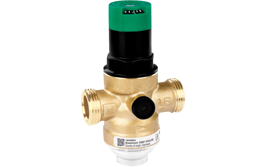 Resideo, 9.1-D42, stellt neben dem Braukmann-Druckminderer D06F als bleifreie Variante D06-LFE seine neuesten Wärmepumpen- und Hybridlösungen sowie H2-Ready-Entwicklungen zur Nutzung von Wasserstoff für den Betrieb von Heizkesseln vor.