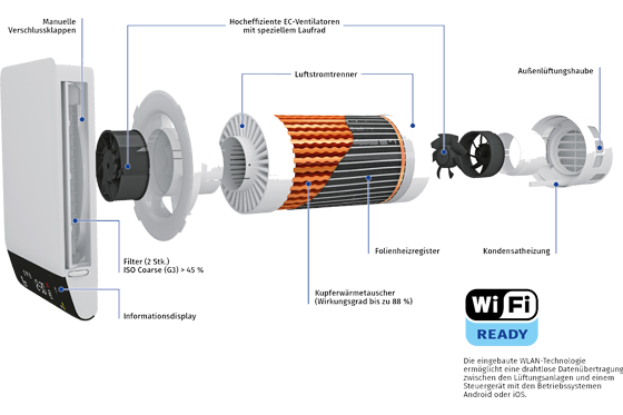Im Mittelpunkt steht die Premiere der neuen dezentralen Einzelraum-Lüftungsgeräte „Freshpoint“. Das System arbeitet dank seiner zwei EC-Ventilatoren für Zu- und Abluft druckneutral. Dadurch wird die Luft kontinuierlich ausgetauscht, ohne dass wie bei herkömmlichen Pendellüftern ein zweites Gerät erforderlich ist. Das reduziert den Installationsaufwand und die Kosten. Durch das geräteeigene WLAN sind weder externe Steuerungen noch zusätzliche Verkabelungen nötig.