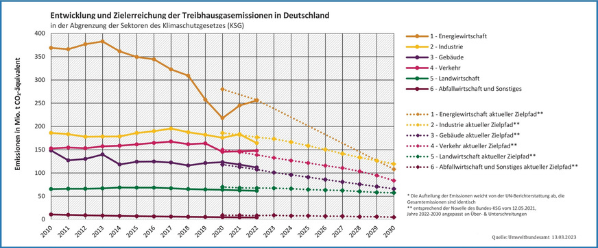 Insgesamt sind die Emissionen seit 1990 in Deutschland damit um 40,4 % gesunken und die Summe der Zielwerte des KSG wurde eingehalten. Im Energiesektor gab es einen bedeutenden Anstieg, weil trotz den Einsparungen beim Erdgas ein vermehrter Einsatz vor allem von Stein- und Braunkohle zur Stromerzeugung die Emissionen erhöht hat. Die höhere Stromerzeugung aus erneuerbaren Energien konnte der Anstieg gedämpfen, sodass der Energiesektor seine Jahresemissionsmenge für 2022 knapp eingehalten hat. Die Sektoren Verkehr und Gebäude lagen dagegen wieder über den im KSG festgelegten maximalen Jahresemissionen.