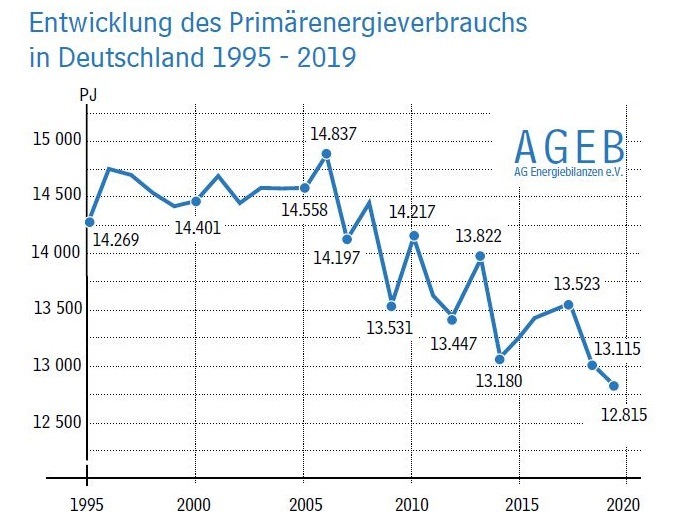 Der Energieverbrauch in Deutschland erreichte 2019 nach vorläufigen Berechnungen der Arbeitsgemeinschaft Energiebilanzen (AG Energiebilanzen) eine Höhe von 12.815 PJ bzw. 3560 TWh (Mrd. kWh). Das entspricht einem Rückgang um 2,3 % gegenüber dem Vorjahr.