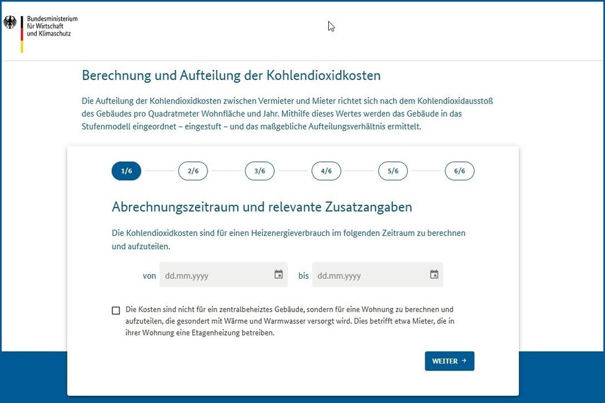 Laut BMWK unterstützt das Tool Vermietende und Mietende mit eigenem Gas- oder Wärmeversorgungsvertrag bei der Anwendung des Kohlendioxidkostenaufteilungsgesetzes. Es führt durch die notwendigen Rechenschritte, fragt die notwendigen Daten und Informationen ab und gibt das Ergebnis der Aufteilung und Berechnung in einem PDF aus, das zu den eigenen Unterlagen genommen oder zur Vorbereitung einer Betriebskostenabrechnung verwendet werden kann.