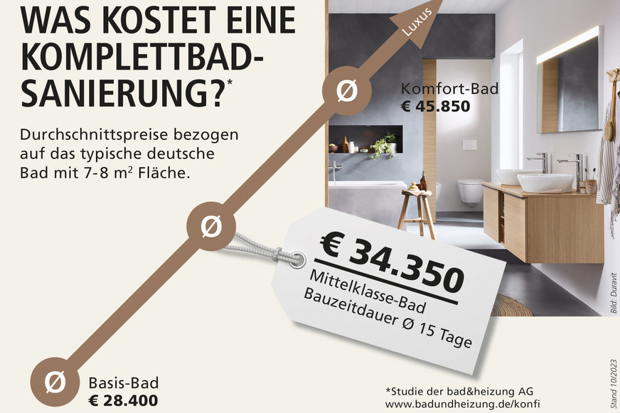 Für gehobene Ansprüche lag der Preis für ein Komfort-Bad bei durchschnittlich 45.850 Euro. Bei ausgefallenen Wünschen wie einer Echtholzbadewanne oder einem volldigitalisierten Regenhimmel und elektronisch gesteuerten Armaturen, besonderen Fliesen oder Marmor können auch mal 80.000 Euro pro Bad zusammenkommen. Der untere Durchschnittswert für die fachgerechte, individuelle Komplettbadsanierung eines 7 bis 8 m² großen Basis-Bades liegt bei 28.400 Euro. Über alle drei Kategorien hinweg wurden regionale Unterschiede festgestellt. Ist das Budget geringer, kann eine Teilsanierung in Angriff genommen werden. Die Dauer für die Komplett-Sanierung liegt im Schnitt bei 15 Arbeitstagen. ■