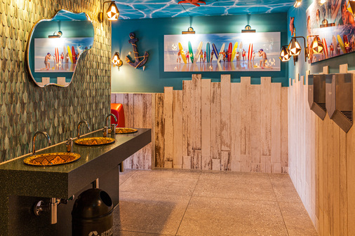 Eingebettet sind die WCs in ein vergnügliches maritimes Ambiente: Die Decken der Sanitärbereiche erinnern an Meeresböden auf denen sich das Spiel von Licht und Wellen widerspiegelt, dazwischen kleine und große Seesterne in Rot- und Blautönen. Die WC-Kabinen sind wie alte Strandumkleiden gestaltet, die Spiegel über den bunten Waschtischen mit Rettungsringen eingefasst, die Leuchten sturmtauglich und an den Wänden finden sich Anker sowie Fotografien und Gemälde vom Strandleben.