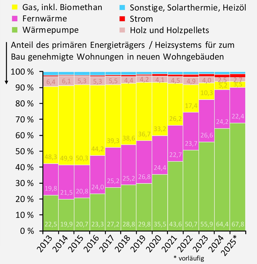 Beim Wohnungsneubau sind elektrisch angetriebene Heizungs-Wärmepumpen schon seit dem Jahr 2020 das führende Heizsystem, seit dem Jahr 2022 liegt der Marktanteil über 50 %. Im Jahr 2025 ist ihr Marktanteil auf 67,8 % gestiegen.