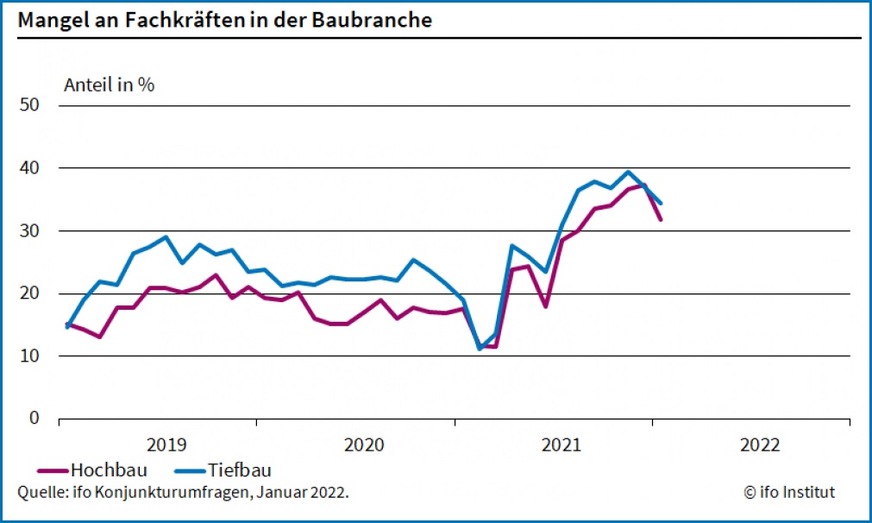 Die Entspannung bei den Fachkräften zeigt sich in Hoch- wie Tiefbau: Sowohl im Hochbau als auch im Tiefbau ging der Fachkräftemangel leicht zurück: 34,4 % der Tiefbaubetriebe berichteten im Januar 2022 über einen Mangel an geeigneten Bewerbern, etwas weniger als im Vormonat 37,1 %.