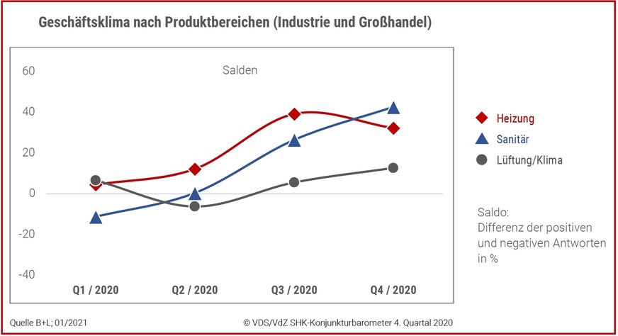 Im Bereich Sanitär gab es im 4. Quartal 2020 einen virulenten Anstieg des Geschäftsklimas. Nachdem die Erwartungen der Unternehmen im Sanitärbereich zu Beginn der Pandemie stark gedämpft waren, übertrafen zum Jahresende die Geschäftserwartungen im Sanitärbereich die der Bereiche Heizung und Lüftung / Klima. „Die starke Inlandsnachfrage führt zum Jahresende zu einer positiven Bewertung der Geschäftslage und der zukünftigen Geschäftserwartungen im Sanitärbereich. Damit können wir nach einem turbulenten Jahr mit einer positiven Entwicklung ins Jahr 2021 starten“, sagt Jens Wischmann, Geschäftsführer VDS.