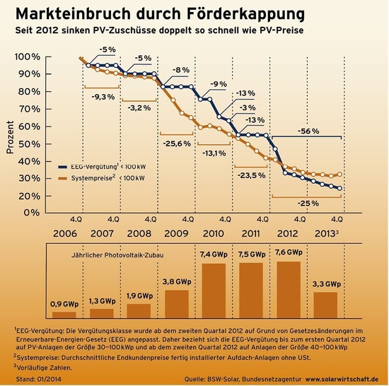 Im Jahr 2013 ist in Deutschland rund 55 % weniger elektrische Nennleistung aus Photovoltaik-Anlagen mit Vergütung über das Erneuerbare-Energien-Gesetz (EEG) als im Vorjahr installiert worden. Die neu installierte Solarstromleistung sank von 7,6 GW p im Jahr 2012 auf rund 3,3 GW p in 2013, teilt der Bundesverband Solarwirtschaft (BSW-Solar) mit. Der Branchenverband warnt vor einem weiteren Markteinbruch und appelliert an die Bundesregierung, das Abschmelzen der Solarstromförderung künftig wieder am technologischen Fortschritt zu orientieren. Während die Preise neuer Solarstromanlagen in den vergangenen zwei Jahren um rund ein Viertel sanken, wurde die Solarstromförderung im gleichen Zeitraum im Rahmen mehrerer Gesetzesänderungen halbiert und damit doppelt so stark beschnitten. https://www.solarwirtschaft.de/