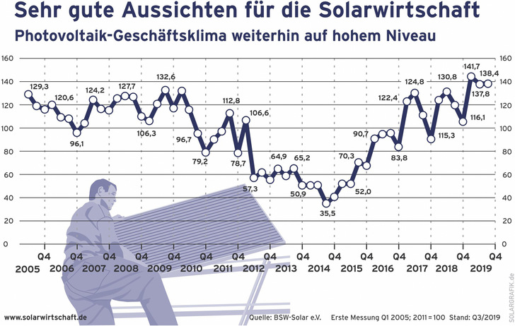 Der vom Bundesverband Solarwirtschaft (BSW-Solar) erhobene Geschäftsklimaindex Photovoltaik verbleibt aktuell auf seinem Allzeithoch. „Die vom Bundeskabinett im Klimaschutzpaket beschlossene Abschaffung des 52-GW-Förderdeckels sorgt für Zuversicht. Die Unternehmen verlassen sich darauf, dass die Marktöffnung für Solardächer wie versprochen noch in diesem Jahr erfolgt. Wir erwarten eine schnelle Anhebung der Photovoltaik-Ausbauziele und Zielkorridore im Erneuerbare-Energien-Gesetz“, so BSW-Hauptgeschäftsführer Carsten Körnig. Im Rahmen des Klimaschutzprogramms 2030 hat die Bundesregierung beschlossen, bis zum Jahr 2030 die installierte Solarstromleistung auf etwa 98 GW zu verdoppeln. Nach übereinstimmender Auffassung des Branchenverbands und von Marktforschern muss diese Marke bereits Mitte der 2020er-Jahre erreicht werden. Nur so könne eine Stromerzeugungslücke infolge des Kernenergie- und Kohleausstiegs vermieden werden, ohne die Klimaschutzziele weiterhin zu verfehlen. Der BSW forderte die Bundesregierung auf, zur Umsetzung angemessenerer Ausbauziele schnell weitere Marktbarrieren einzureißen. Seit Jahren ganz vorne auf der Wunschliste der Unternehmer: Die Streichung der anteiligen EEG-Umlage auf selbst verbrauchten oder direkt belieferten Solarstrom für Miet- und Gewerbequartiere. Die Klimaschutzpläne der Regierung sorgen auch im Bereich der Solarwärme für Optimismus. Körnig:. „Es ist höchste Zeit, dass auch in den Wärmesektor mehr Modernisierungsdynamik kommt und das große Potenzial der Solarthermie in der Raum-, Prozess- und Fernwärme deutlich stärker genutzt wird.“