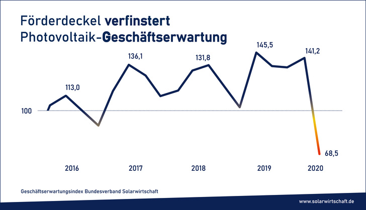Die Geschäftserwartung in der deutschen Photovoltaikbranche ist nach Angaben des Bundesverbands Solarwirtschaft (BSW-Solar) in den letzten Wochen massiv eingebrochen. Schuld daran sind nach Angaben des Verbands nicht die Auswirkungen der Coronavirus-Krise, sondern der in Kürze erreichte 52-GW-Förderdeckel für neue Solarstromanlagen. Die Bundesregierung hatte sich im letzten Herbst zwar auf eine zeitnahe Abschaffung der Förderbegrenzung für neue Solarstromanlagen im EEG verständigt, diese aber gesetzgeberisch bis heute nicht umgesetzt.