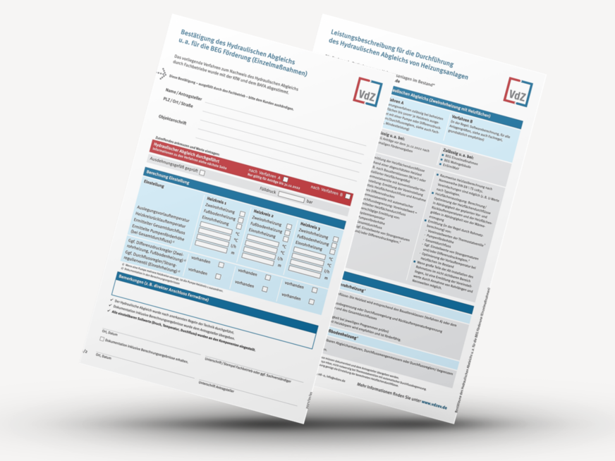 Die VdZ-Formulare zur Durchführung und Bestätigung des hydraulischen Abgleichs wurden aktualisiert. Für Anträge über die BEG 2023 ist nun ausschließlich das Verfahren B zulässig.