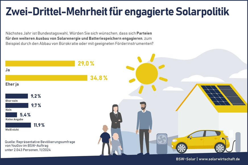 Der Bundesverband Solarwirtschaft (BSW-Solar) erwartet, dass auf Basis verlässlicher und attraktiver Investitionsbedingungen ein verstärkter Ausbau und damit günstige Energiekosten möglich sind. Dies könne auch spürbar zur Belebung der Wirtschaft beitragen. Und der Verband sieht dafür auch großen Rückhalt in der Bevölkerung: Beinahe eine Zweidrittelmehrheit der Bevölkerung (64 %) wünsche sich, dass sich die Parteien für den weiteren Ausbau von Solarenergie und Speichern engagieren. Dies gehe aus einer YouGov-Repräsentativbefragung im Auftrag des BSW-Solar hervor, die vom 5. – 6. November 2024 unter über 2000 Wahlberechtigten durchgeführt wurde (siehe Infografik; die Ampel-Koalition wurde faktisch am Abend des 6. November 2024 beendet).