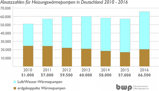 17 % Marktwachstum machen 2016 zum Wärmepumpen-Rekordjahr. Mit 66 500 Heizungswärmepumpen wurde 2016 der bislang höchste Absatz erzielt. Größter Gewinner sind erdgekoppelte Systeme: Gegenüber dem Vorjahr legten sie um 21,8 % zu, allerdings auf geringem Niveau: 2016 wurden 20 700 Geräte verkauft, 2015 waren es 17 000 Geräte. Luft/Wasser-Wärmepumpen legten um 14,5 % auf 45 800 zu (2015: 40 000 Stück). Wie im Vorjahr waren dabei insbesondere Monoblockgeräte mit einem Zuwachs von 19,5 % beliebt (2016: 25 100; 2015: 21 000). Bei den gesplitteten Geräten fiel das Wachstum mit 8,9 % etwas kleiner aus (2016: 20 700; 2015: 19 000). Der Absatz von Trinkwasser-Wärmepumpen blieb mit 12 500 Geräten gegenüber dem Vorjahr unverändert. Mit 62 500 abgesetzten Heizungswärmepumpen war 2008 bisher das erfolgreichste Jahr für die Wärmepumpe. Teures Heizöl machte damals erneuerbare Energien für viele Verbraucher attraktiv. Heute haben sich diese Rahmenbedingungen ins Gegenteil verkehrt: Während der Heizöl- und der Erdgaspreis 2016 auf neue Rekordtiefs fielen, sind die Strompreise seit Jahren gestiegen. Bei der Einordnung der Zahlen für 2016 ist auch zu berücksichtige, dass 2008 der Absatz für Wärmeerzeuger insgesamt eher schwach war und 2016 der Neubau deutlich zugelegt hat. Dr. Martin Sabel, Geschäftsführer des Bundesverbands Wärmepumpe (BWP): „Fast 17 % Marktwachstum sind ein ermutigendes Signal für unsere Branche. Die hohen Fördersätze des Marktanreizprogramms seit April 2015 und die verschärften Anforderungen der Energieeinsparverordnung seit Anfang 2016 waren Wegbereiter für diesen Aufschwung. Betrachtet man die absoluten Verkaufszahlen, sieht man jedoch, dass die Wärmepumpe noch weit davon entfernt ist, ihr volles Potenzial für den Klimaschutz zu entfalten. Die Energiewende ist leider noch immer nicht im Heizungskeller angekommen.“ Während die Wärmepumpe in jedem dritten neu gebauten Wohngebäude und damit für etwa 25 % der neu gebauten Wohnungen eingesetzt wird, bleibt mit einem Marktanteil unter 5 % der Erfolg im Gebäudebestand bisher aus. Diesen Bereich muss die Politik adressieren, fordert Sabel. Wegen der höheren Energieverbräuche in älteren Gebäuden reagierten die Verbraucher hier sensibler auf den Preis der Energieträger als in sparsamen Neubauten. Der BWP kritisiert schon seit einigen Jahren, dass der Heizstrompreis von über 21 Ct/kWh zu rund 76 % aus Steuern, Abgaben und Umlagen besteht, während Heizöl in Deutschland kaum besteuert wird. Der Verband fordert, die Steuern und Abgaben der Energieträger neu auszurichten, beispielsweise an den CO 2 -Emissionen. www.waermepumpe.de