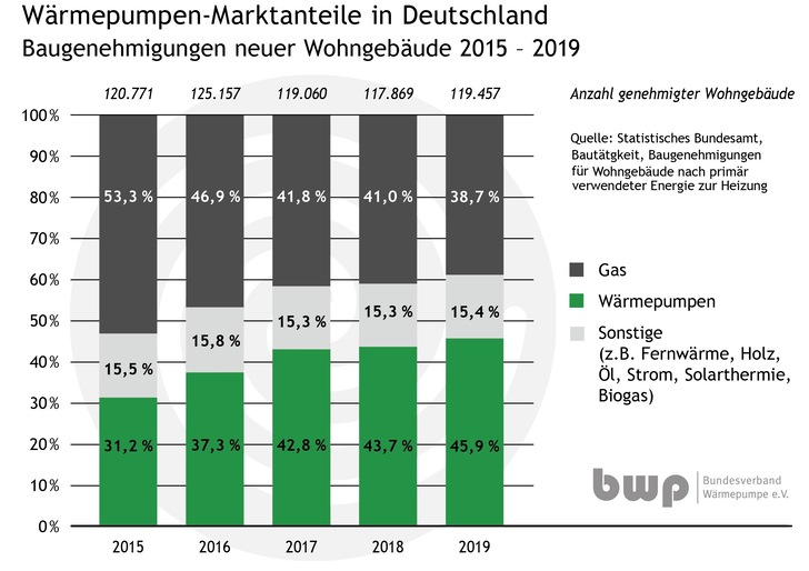 Mit einem Anteil von rund 46 % bei genehmigten Wohngebäuden hat das Heizungssystem Wärmepumpen nach den aktuellen Zahlen des Statistischen Bundesamts im Jahr 2019 den Spitzenplatz als primär verwendetes System zum Heizen verteidigt und den Vorsprung vor Heizsystemen mit dem Energieträger Gas weiter vergrößert.
