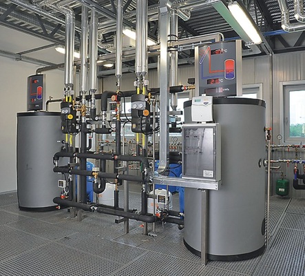 Im 2008 eingeweihten Forschungszentrum Cubo Rosso (Roter Würfel) von Caleffi am Hauptfirmensitz in Fontaneto d’Agogna (Norditalien) werden innovative Komponenten und komplette Systemschnittstellen für Solarthermie-, Photovoltaik- und Geothermieanlagen bis zur Serienreife entwickelt. Die Entscheidung, dem weithin sichtbaren Gebäude die Signalfarbe rot zugeben, die nicht zu den offiziellen CI-Farben von Caleffi gehört, hat durchaus symbolhaften Charakter. Rot signalisiert einen nach außen sichtbaren Aufbruch des Unternehmens. Caleffi setzt mittel- und langfristig im Bereich der erneuerbaren Energien vermehrt auf Forschung und Entwicklung im Bereich der Schnittstellen und Systemeinbindung – den Innovationsprozess sieht man als Fundament für ein gesundes wirtschaftliches Wachstum. Zu den Aufgaben des Cubo Rosso gehören neben den reinen Forschungs- und Entwicklungsarbeiten auch spezifische Versuche zur Lebensdauer von Werkstoffen und deren Anwendung unter schwierigen Bedingungen sowie Machbarkeitsstudien über den Einsatz von neuen Technologien. Dazu Inhaber Marco Caleffi: „Der Fortschritt in der Nutzung alternativer Energien besteht nicht nur darin, innovative Produkte mit messbarer Steigerung der Wirkungsgrade zu entwickeln und serienreif zu machen – sondern er reflektiert auch die Veränderung der Beziehung zwischen den Menschen und ihrer Umwelt. Diese veränderte Wahrnehmung nimmt Einfluss auf die Wechselbeziehung zwischen Wirtschaft und Umwelt und manifestiert sich in dem Engagement des Unternehmen und seiner Mitarbeiter. Unser ganz persönliches Engagement besteht darin, stets mit höchster Aufmerksamkeit neuen Herausforderungen entgegenzutreten, die der schonende Umgang mit den natürlichen Ressourcen uns abfordert. So können wir – unter Wahrung aller Aspekte unserer unternehmerischen Verantwortung – die Qualität unserer Produkte hinsichtlich eines niedrigen Energieverbrauchs spürbar verbessern. Dies zum Nutzen unserer Kunden und der Umwelt.“ Ganz im Sinne der ökologischen und ökonomischen Nachhaltigkeit ist das Gebäude als Energiesparhaus konzipiert und völlig energieautark. Alle installierten Systeme zur Nutzung erneuerbarer Energiequellen werden voll genutzt. Die Klimatisierung (Heizung und Kühlung) erfolgt über eine geothermische Anlage, warmes Wasser wird über eine solarthermische Anlage produziert, elektrischer Strom über eine Photovoltaikanlage. Von jedem System gibt es zwei Aggregate, von denen eines jeweils ausschließlich für Versuchszwecke bestimmt ist, während die andere Anlage tatsächlich für die Bereitstellung von Energie genutzt wird. Der vom renommierten Mailänder Architekturbüro Tekne entworfene und in enger Zusammenarbeit mit Caleffi-Technikern für rund 4 Mio. Euro realisierte Cubo Rosso ist in die Energie-Effizienz-Klasse A eingestuft mit einem Gesamtwärmeenergiebedarf von 15,86 kWh/(m 2 a), was dem Passiv-Haus-Standard entspricht. Es besteht aus drei Ebenen mit zusammen 2700 m 2 , auf denen die Haustechnik, die Laboratorien und Forschungs- sowie Demonstrationsräume untergebracht sind. Im Testfeld stehen hydraulische Anlagen zur Prüfung und Bestimmung von Druckverhältnissen und Durchflüssen, Prüfstände für thermische Schocks und Materialermüdungstests, für den Test von Material- und Produktlebensdauer, für Systemtrenner, für Funktionstests von Sicherheitsventilen, Thermostatmischventilen, elektronischen Mischern, Thermostatventilen, Komponenten für Heiz-/Kühlanlagen, Fernwärmestationen sowie Gaswandkesseln und Solarkollektoren zu Verfügung. Weiterhin gehören eine thermische Solaranlage, eine Prüfanlage für Geothermie, eine Geothermieanlage, eine Photovoltaikanlage und ein Kontrollsystem für HVAC zur Ausstattung.
