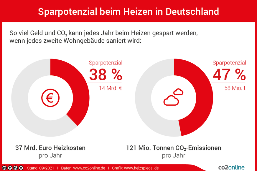 Mehr Energieeffizienz würde den Stromverbrauch ebenfalls deutlich sinken lassen. Laut co2online gibt es ein jährliches Sparpotenzial von rund 10 Milliarden Euro und 32 Terawattstunden. Das entspricht 50 % der Stromerzeugung durch Erdgas. Durch das Sparen bei Heizen und Strom ließen sich insgesamt etwa 73 Millionen Tonnen CO2 vermeiden. Das wären 50 % der Emissionen des deutschen Gebäudebestands.