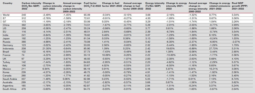 Die Dekarbonisierung schreitet in den G7- und E7-Ländern unterschiedlich schnell voran. Die G7-Länder erreichten 2022 eine Verringerung der Emissionen um 1,2 % gegenüber einem jährlichen Durchschnitt von 2,3 % seit 2019. Im Gegensatz dazu verzeichneten die E7-Länder 2022 eine Dekarbonisierungsrate von 2,8 % gegenüber einem jährlichen Durchschnitt von 1,7 % seit 2019. Zum Vergleich: In Deutschland betrug die Rate vergangenes Jahr rund 3 % und lag damit knapp über dem hiesigen Jahresdurchschnitt (2,42 %).