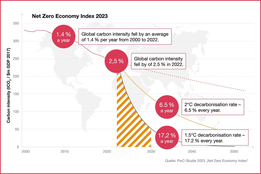 Der PwC Net Zero Economy Index 2023 zeigt: Das 1,5-Grad-Ziel erfordert nun eine Dekarbonisierungsrate von 17,2 %/a. Aber: Kein G20-Land hat seit 2000 eine Dekarbonisierungsrate von mehr als 11 %/a erreicht.