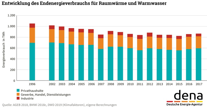 Der Energieverbrauch für Raumwärme und Warmwasser in Wohn- und Nichtwohngebäuden betrug im Jahr 2017 deutschlandweit insgesamt 870 TWh und liegt damit trotz politisch angestrebter Einsparungen leicht über dem Niveau von 2010 (865 TWh). Grund dafür sind vor allem fehlende Anreize für Sanierungsmaßnahmen und den Einsatz innovativer Technik. Die Sanierungsrate stagniert weiter bei etwa 1 %/a, obwohl zum Erreichen der Klimaziele mindestens 1,5 % notwendig wären. Immerhin besteht durch das Klimapaket der Bundesregierung Aussicht auf einen Kurswechsel und neue Dynamik im Markt. Das geht aus dem dena-Gebäudereport Kompakt 2019 „Statistiken und Analysen zur Energieeffizienz im Gebäudebestand“ der Deutschen Energie-Agentur (dena) hervor.
