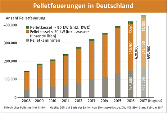 Für die Pelletbranche blieb das Jahr 2016 hinter den Erwartungen zurück. Der Deutsche Energieholz- und Pellet-Verband (DEPV) bilanziert wie schon im Vorjahr, dass der niedrige Ölpreis den Heizungstausch und somit auch den Zubau von Pelletfeuerungen gebremst hat. Trotz klimapolitischer Diskussionen und staatlicher Kampagne kam die Energiewende am Wärmemarkt auch 2016 nicht in Fahrt. Der angestrebte Zubau von 38 000 neuen Pellet-Heizkesseln und -Kaminöfen wurde mit 31 400 Stück deutlich nicht erreicht, gegenüber dem bereits schwachen Jahr 2015 (Zubau 32 500 Feuerungen) ist dies ein nochmaliger Rückgang um rund 3 %. Auch die hohen Fördersätze im Marktanreizprogramm für erneuerbare Energien (MAP), die mit dem Aktionsprogramm Energieeffizienz (APEE) im Januar 2016 sogar noch um 20 % erhöht wurden, haben nicht zu einem Aufschwung geführt. Eine gute Nachfrage in einigen Bundesländern bereits zu Beginn des Jahres 2017 lässt die Pelletbranche jedoch mit verhaltenem Optimismus in die Zukunft blicken: Für das Jahr 2017 geht der DEPV von einem Absatz von 33 000 Feuerungen (16 000 Pellet-Heizkessel und 17 000 Pellet-Kaminöfen) aus. Damit würde der Gesamtbestand an Pelletfeuerungen auf knapp 454 000 Anlagen anwachsen. www.depv.de