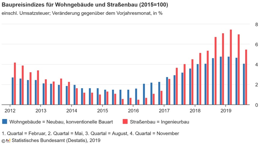 Die Preise für den Neubau konventionell gefertigter Wohngebäude in Deutschland steigen weiter stark: Im August 2019 lagen sie nach Angaben des Statistischen Bundesamts (Destatis) um 4,1 % höher als im Vorjahresmonat. Im Mai 2019 hatte der Preisanstieg im Jahresvergleich bei 4,7 % gelegen. Im Vergleich zum Mai 2019 erhöhten sich die Preise im August 2019 um 0,7 %. Alle Preise beziehen sich auf Bauleistungen am Bauwerk einschließlich Umsatzsteuer.
