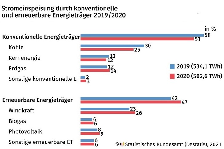 Der Rückgang ist zumindest teilweise auf den niedrigeren Strombedarf infolge des Lockdowns zur Eindämmung der Coronavirus-Pandemie im Frühjahr 2020 zurückzuführen. Der Anteil der erneuerbaren Energien an der im Inland erzeugten und eingespeisten Strommenge erreichte unterdessen einen neuen Höchststand: Er stieg von 42,3 % im Jahr 2019 auf 47,0 % im Jahr 2020.