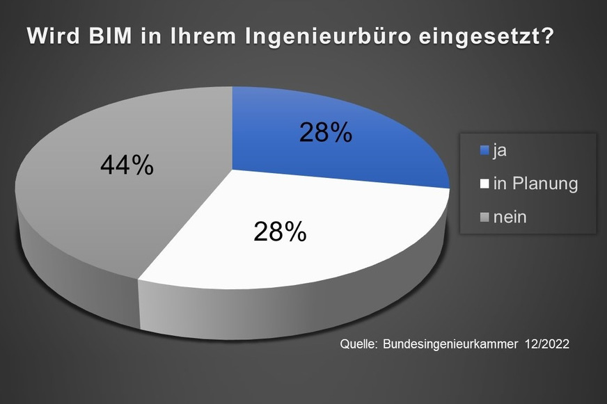 Eine aktuelle Umfrage der Bundesingenieurkammer geht der Frage nach, wie weit die Digitalisierung im Arbeitsalltag der Ingenieurbüros fortgeschritten ist. Die Ergebnisse zeigen, dass die Mehrheit der Befragten aktuell nicht mit BIM arbeitet. So gaben nur 28 % an, die Planungsmethode anzuwenden. Vom Großteil derer, die BIM nicht nutzen, planen jedoch 28 % die Einführung.