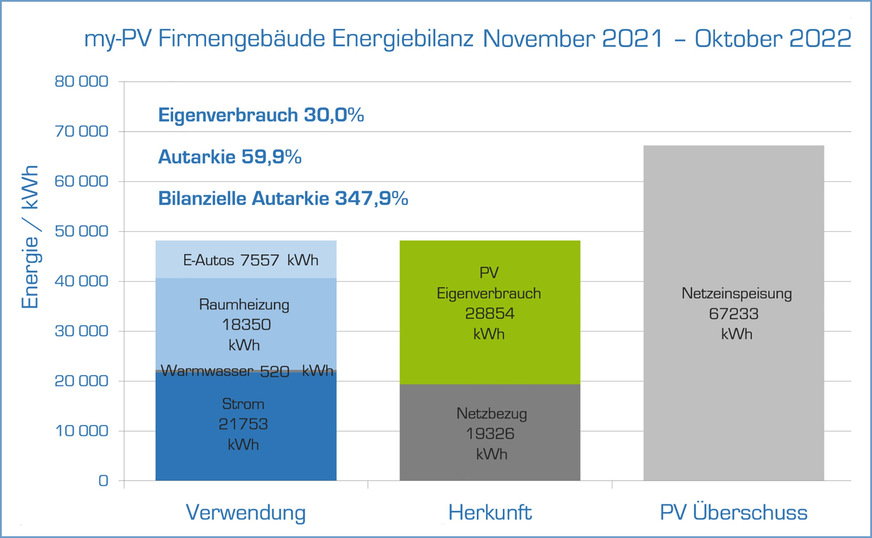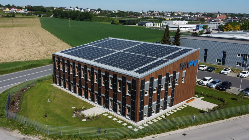 Das Firmengebäude von my-PV in Neuzeug, Österreich, hat im ersten Betriebsjahr eine bilanzielle Autarkie von 347,9 % erreicht. Dieser Wert ergibt sich aus der Bilanz der Netzeinspeisung und des Netzbezugs. Die Bilanz umfasst alle Sektoren, also neben den elektrischen Verbrauchern im Gebäude auch die Trinkwassererwärmung, die komplette Erzeugung von Raumwärme und die Mobilität, denn my-PV versorgt alle vier Sektoren rein elektrisch.