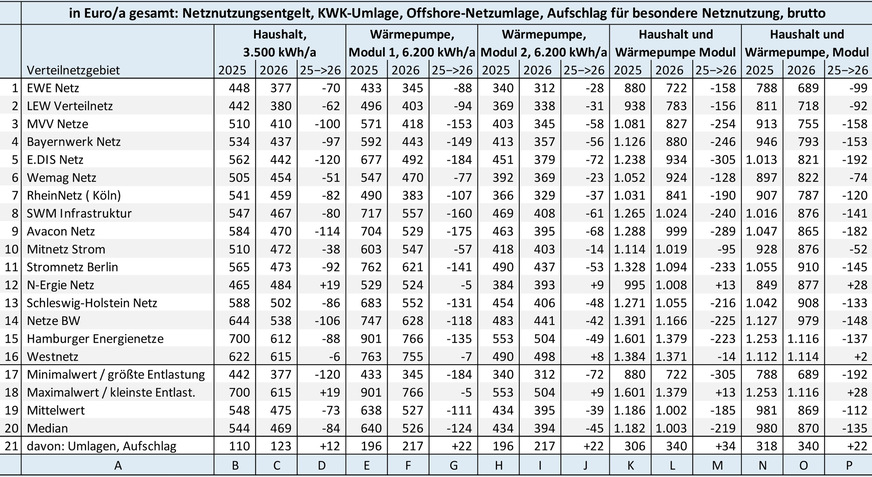 Die Tabelle zeigt die Summe aus Netznutzungsentgelt (ohne Messstellenbetrieb), den Umlagen sowie dem Aufschlag für besondere Netznutzung für 16 Verteilnetzbetreiber und drei Entnahmefälle bzw. zwei kombinierte Entnahmefälle in den Jahren 2025 und 2026 (auf Basis der noch vorläufigen Preisblätter) sowie die sich daraus ergebende Änderung. Zeile 21 zeigt nachrichtlich separat die Wirkung von KWK-Umlage, Offshore-Netzumlage sowie dem Aufschlag für besondere Netznutzung (jeweils brutto).