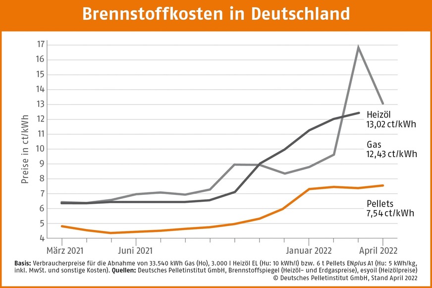 Bei einer Abnahmemenge von 6 t kosten Holzpellets nach Angaben des Deutschen Pelletinstituts (DEPI) im April 2022 durchschnittlich 377,21 Euro/t. Das sind 2,1 % mehr als im Vormonat und 66,4 % mehr als im April 2021. Der Preisvorteil gegenüber den fossilen Energieträgern Gas und Heizöl ist mit rund 40 % aber groß geblieben, der Brennstoff Holzpellets kostete im April 2022 umgerechnet 7,54 Ct/kWh.