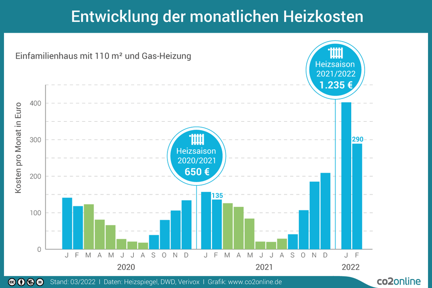 Auch mit Blick auf die gesamte Heizperiode von September 2021 bis Februar 2022 sind die Kosten im Vergleich zum Vorjahreszeitraum kräftig gestiegen: Für eine durchschnittliche Wohnung mit Gasheizung von 335 auf 630 Euro (+ 90 %); für ein Einfamilienhaus von 650 auf 1235 Euro (+ 90 %). Bei einer Wärmepumpe im Eigenheim sind es statt 755 Euro nun 1050 Euro (+ 39 %).