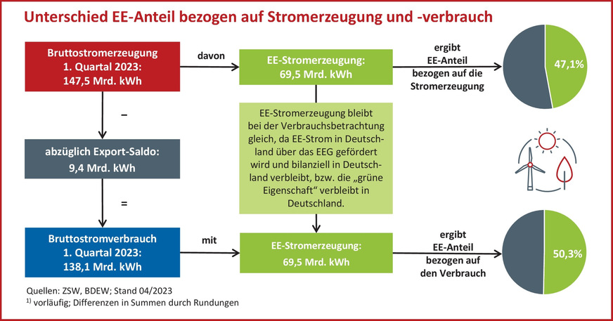 Eine andere Möglichkeit ist, den Anteil der Erneuerbaren Energien an der Bruttostromerzeugung zu messen. Sie umfasst die gesamte in Deutschland erzeugte Strommenge, also auch die exportierten Strommengen. Der Anteil erneuerbarer Energien im 1. Quartal 2023 auf Basis der Bruttostromerzeugung beträgt rund 47 %.