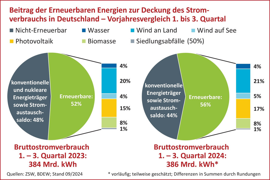 Erneuerbare Energien haben von Januar bis September 2024 rund 56 % von Deutschlands Bruttoinlandstromverbrauch gedeckt. Ein Plus von knapp vier Prozentpunkten im Vergleich zum Vorjahreszeitraum. Das zeigen vorläufige Berechnungen des Zentrums für Sonnenenergie- und Wasserstoff-Forschung Baden-Württemberg (ZSW) und des Bundesverbands der Energie- und Wasserwirtschaft (BDEW).