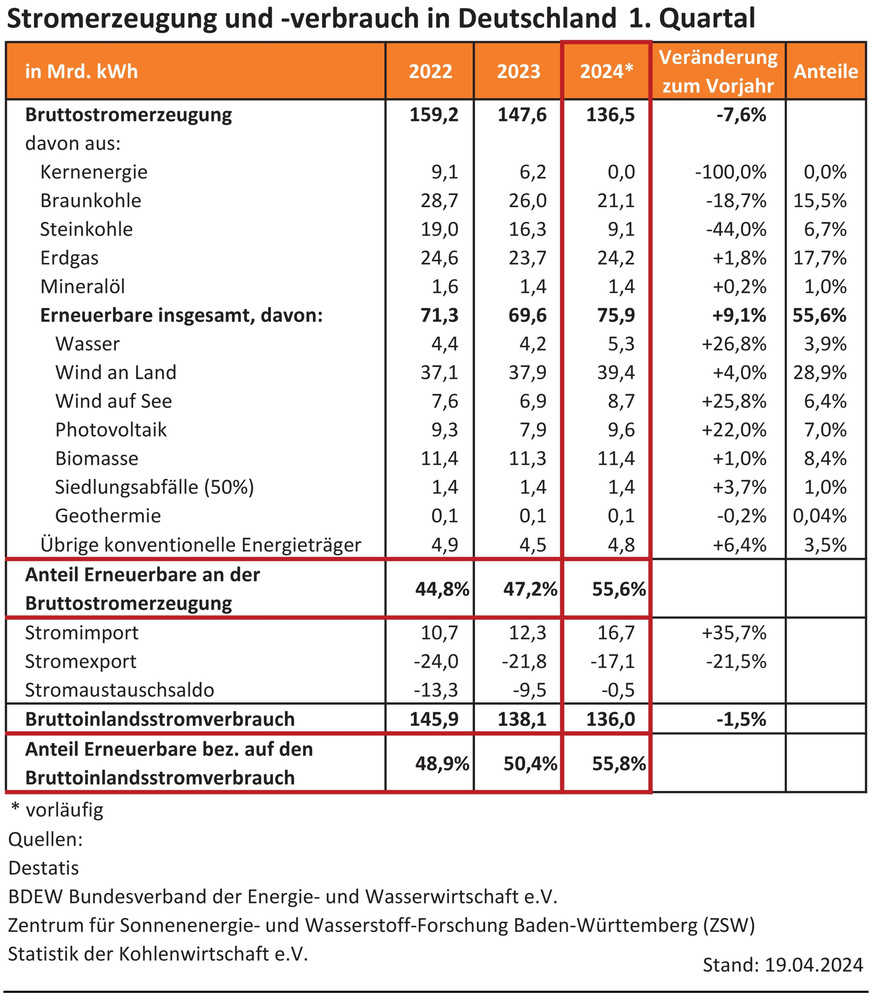 Im 1. Quartal 2024 lag die gesamte Bruttostromerzeugung bei 136,5 TWh oder 7,6 % weniger als im Vorjahreszeitraum (Q1-2023: 147,6 TWh). Dem stand ein Bruttostromverbrauch von 136,0 TWh gegenüber (Q1-2023: 138,1 TWh). Insgesamt wurden 75,9 TWh Strom aus Sonne, Wind und anderen regenerativen Quellen erzeugt (Q1-2023: 69,6 TWh). Davon stammten