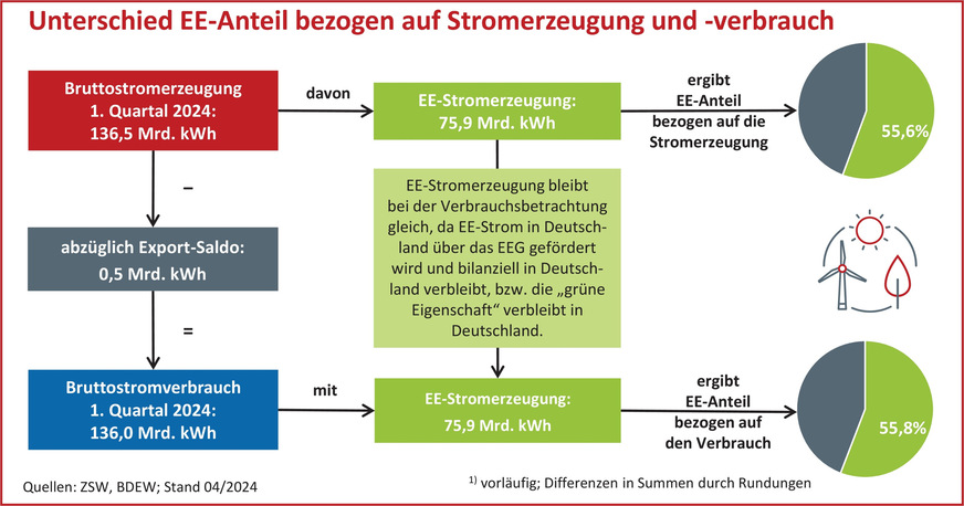 Eine andere Möglichkeit ist, den Anteil der erneuerbaren Energien an der Bruttostromerzeugung zu messen. Sie umfasst die gesamte in Deutschland erzeugte Strommenge, also auch die exportierten Strommengen. Der Anteil erneuerbarer Energien im 1. Quartal 2024 auf Basis der Bruttostromerzeugung beträgt 55,6 %.