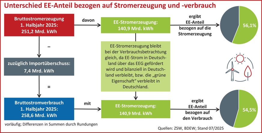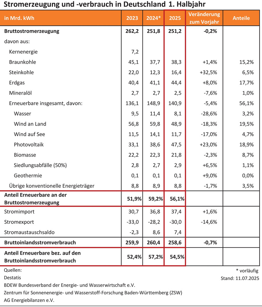 Im 1. Halbjahr 2025 lag die Bruttostromerzeugung bei 251,2 TWh. Mit −0,2 Prozent erreichten die Erneuerbaren fast das Niveau des Vorjahreszeitraums (2024: 251,8 TWh). Dem stand ein Stromverbrauch von 258,6 TWh gegenüber (2024: 260,4 TWh). Insgesamt wurden rund 141 TWh Strom aus Sonne, Wind und anderen regenerativen Quellen erzeugt (2024: 141 TWh). Davon stammten rund