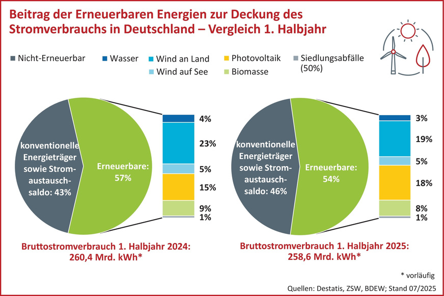 Erneuerbare Energien haben im 1. Halbjahr 2025 rund 54 % des Bruttoinlandsstromverbrauchs in Deutschland gedeckt. Das zeigen vorläufige Berechnungen des Zentrums für Sonnenenergie- und Wasserstoff-Forschung Baden-Württemberg (ZSW) und des Bundesverbands der Energie- und Wasserwirtschaft (BDEW).