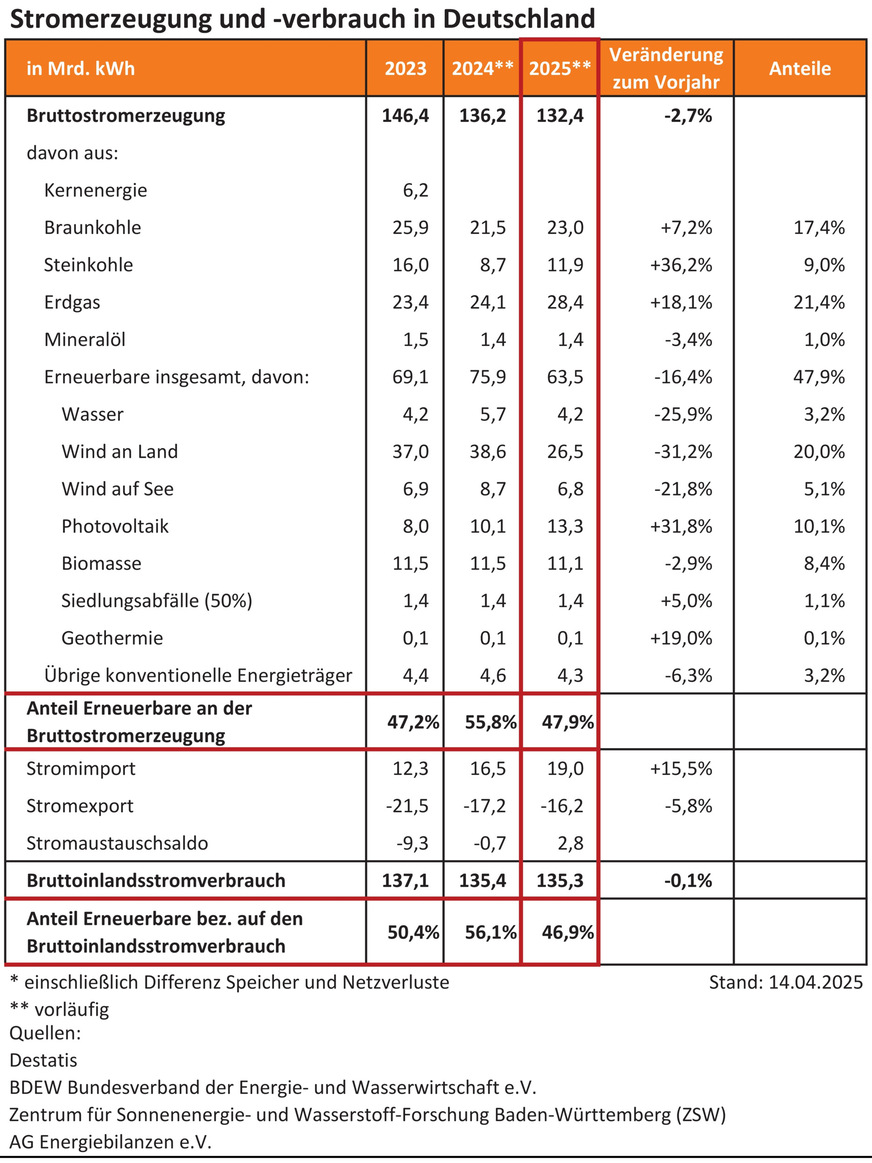 Im 1. Quartal 2025 lag die Bruttostromerzeugung bei 132,4 TWh – ein Rückgang um 2,7 % gegenüber dem Vorjahreszeitraum (2024-Q1: 136,2 TWh). Dem stand ein Bruttostromverbrauch von 135,3 TWh gegenüber (2024-Q1: 135,4 TWh). Insgesamt wurden 63,5 TWh Strom aus Sonne, Wind und anderen regenerativen Quellen erzeugt (2024-Q1: 75,9 TWh). Davon stammten rund