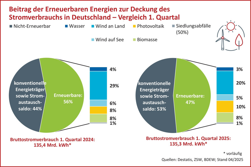 Erneuerbare Energien haben im 1. Quartal 2025 rund 47 % des Bruttoinlandsstromverbrauchs in Deutschland gedeckt. Das zeigen vorläufige Berechnungen des Zentrums für Sonnenenergie- und Wasserstoff-Forschung Baden-Württemberg (ZSW) und des Bundesverbands der Energie- und Wasserwirtschaft (BDEW).