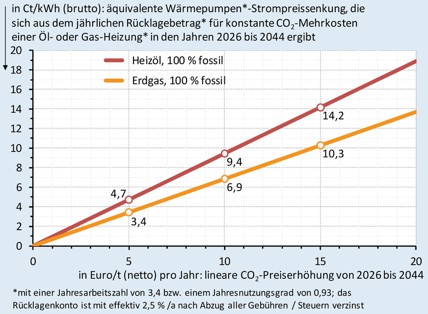 Die CO2-Bepreisung verteuert fossile Brennstoffe wie Erdgas und Heizöl. Rechnet man diese Teuerung in eine äquivalente Strompreissenkung um, ergibt sich ein erheblicher Vorteil für das Heizen mit Wärmepumpen.