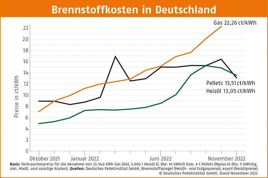 Wie sich diese Situation weiterentwickelt, ist unklar. Sie kann sich mit dem Wintereinbruch und möglicher witterungsbedingter Lieferschwierigkeiten sehr schnell ändern. Daher empfehlen wir Privatkunden, jetzt Pellets zu ordern. Momentan sind die Lieferzeiten kurz.“ Dennoch rechnet der Branchenkenner nicht mit einem Pelletpreis auf Vorkriegsniveau, da Rohstoff, Herstellung und Logistik weiterhin stark von den Preissteigerungen und den Verwerfungen der internationalen Energiemärkte betroffen seien.