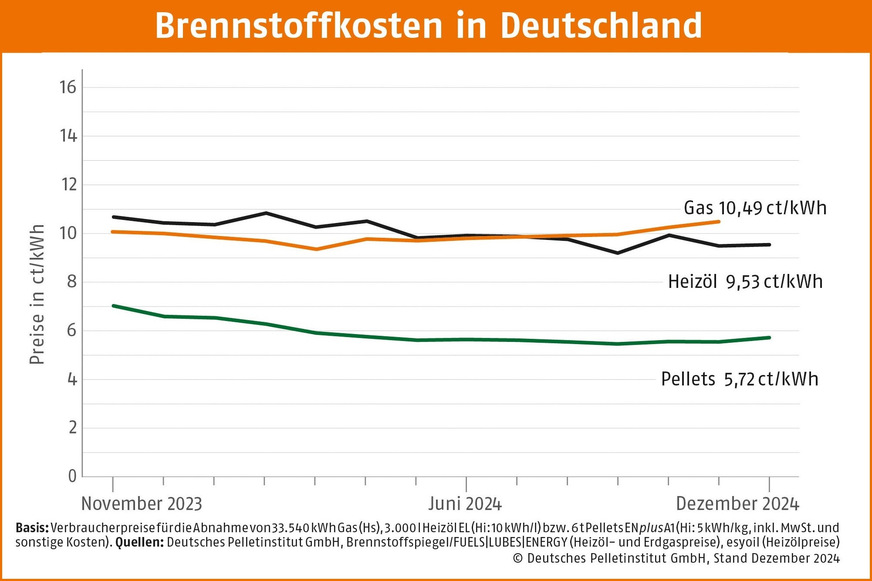 Der Preis für eine Kilowattstunde Wärme aus im Dezember 2024 zum DEPI-Pelletpreis gekauften Pellets beträgt 5,72 Ct/kWh. Damit gibt es einen Preisvorteil zu einem aktuellen Heizöleinkauf von über 40 %. Zu Erdgas besteht ein Preisvorteil von rund 46 % (Vergleichsbasis siehe Grafik).