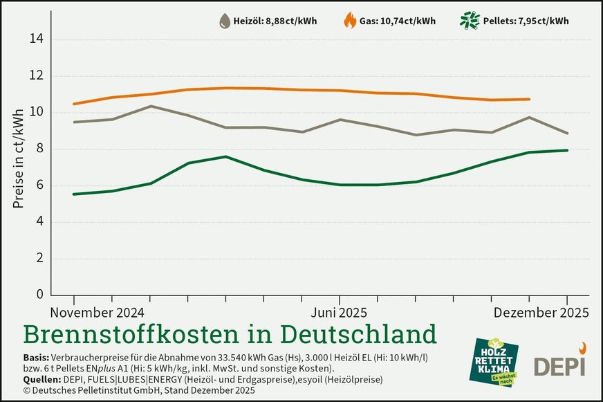 Der Preis für eine Kilowattstunde Wärme aus im Dezember 2025 zum DEPI-Pelletpreis gekauften Pellets beträgt 7,95 Ct/kWh. Damit gibt es einen Preisvorteil zu einem aktuellen Heizöleinkauf von rund 10,4 % (Vergleichsbasis siehe Grafik mit einem auf den Heizwert bezogenen Jahresnutzungsgrad von 1,0).