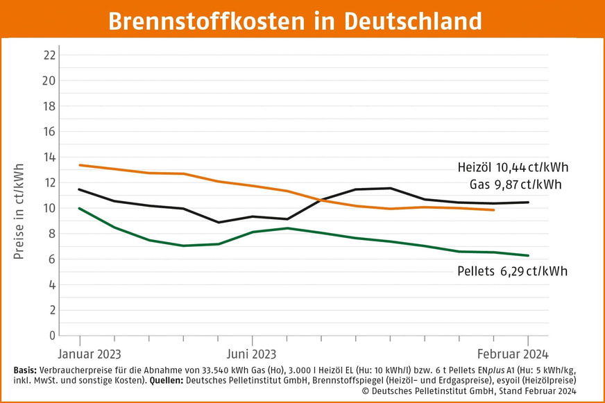 Der Preis für eine Kilowattstunde Wärme aus im Februar 2024 zum DEPI-Pelletpreis gekauften Pellets beträgt 6,29 Ct/kWh. Damit gibt es einen Preisvorteil zu aktuellem Heizöleinkauf von rund 40 %. Zu Erdgas besteht ein Preisvorteil von rund 36 % (Vergleichsbasis siehe Grafik).