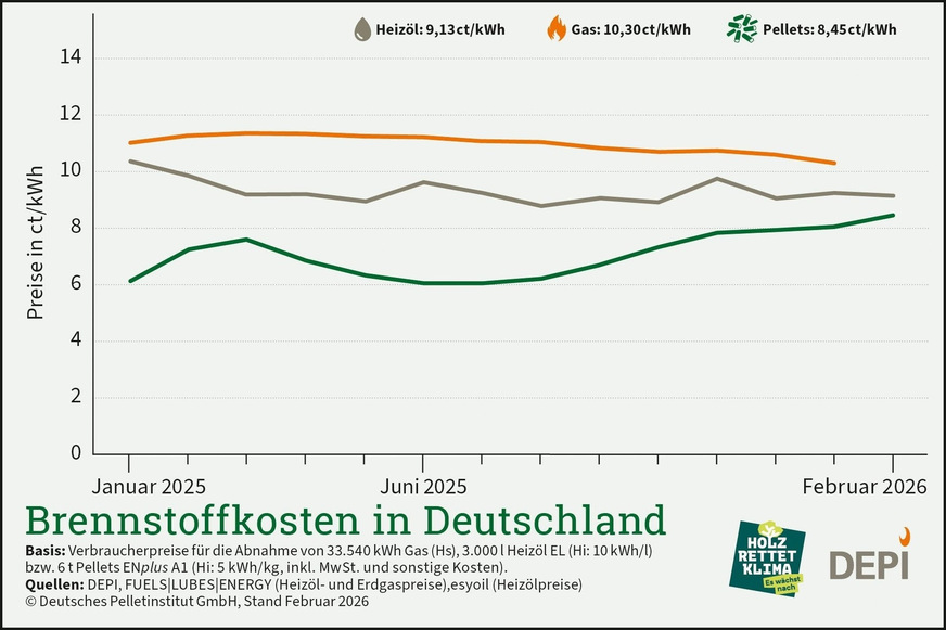 Der Preis für eine Kilowattstunde Wärme aus im Februar 2026 zum DEPI-Pelletpreis gekauften Pellets beträgt 8,45 Ct/kWh. Damit gibt es einen Preisvorteil zu einem aktuellen Heizöleinkauf von rund 7,4 % (Vergleichsbasis siehe Grafik mit einem auf den Heizwert bezogenen Jahresnutzungsgrad von 1,0).