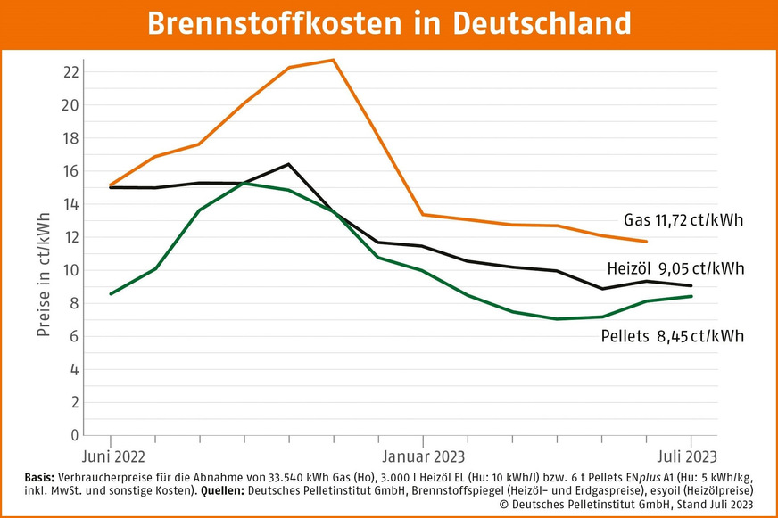 Der Preis für eine Kilowattstunde Wärme aus im Juli 2023 zum DEPI-Pelletpreis gekauften Pellets beträgt 8,45 Ct/kWh. Damit hat sich der Preisvorteil zu Heizöl auf 7 % verringert. Zu Erdgas besteht ein Preisvorteil von rund 30 % (Vergleichsbasis siehe Grafik).