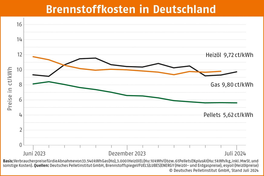 Der Preis für eine Kilowattstunde Wärme aus im Juli 2024 zum DEPI-Pelletpreis gekauften Pellets beträgt 5,62 Ct/kWh. Damit gibt es einen Preisvorteil zu einem aktuellen Heizöleinkauf von über 42 %. Zu Erdgas besteht ein Preisvorteil von rund 43 % (Vergleichsbasis siehe Grafik).