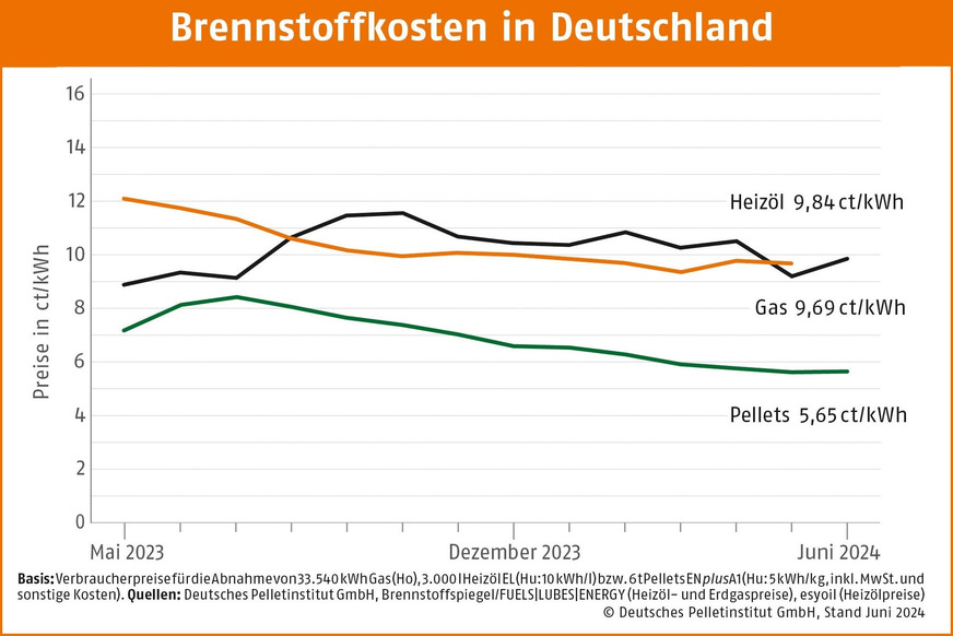 Der Preis für eine Kilowattstunde Wärme aus im Juni 2024 zum DEPI-Pelletpreis gekauften Pellets beträgt 5,65 Ct/kWh. Damit gibt es einen Preisvorteil zu einem aktuellen Heizöleinkauf von über 40 %. Zu Erdgas besteht ein Preisvorteil von ebenfalls über 40 % (Vergleichsbasis siehe Grafik).